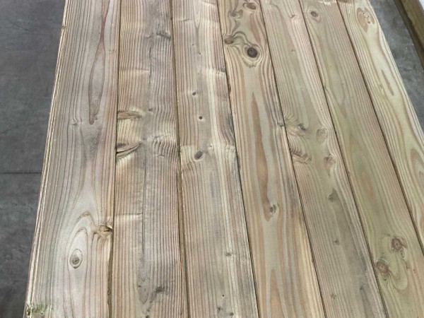 Douglas planken met mes -en groef verbinding, met een afmeting van 500 x 14,5 x 1,8 cm.