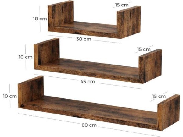 Deze industriële wandplanken van iBella Living zijn ideaal als u weinig ruimte hebt maar toch uw spullen en decoraties kwijt wilt. De u-vormige planken komen als set van 3 en verschillen allemaal in formaat voor een speels effect. Hang deze planken aan de muur in uw slaapkamer, woonkamer, studeerkamer of hal en creëer meer ruimte. Veelzijdig De planken zijn gemaakt van stevig hout in combinatie met zwart metaal. Bij montage aan een massieve wand houdt elke plank houdt tot wel 15kg aan gewicht. U kunt dus gerust uw boeken, planten, decoratie of andere spullen kwijt. Gebruikswijze Monteer de planken eenvoudig aan uw meer met behulp van het bijgeleverde montagemateriaal en de handleiding. Ze kunnen worden gemonteerd op twee verschillende manieren waardoor de planken op elke muur te bevestigen zijn. We raden aan op de planken op een massieve wand of gipsmuur te monteren.