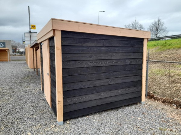 Bestaande uit: Douglaspalen, Zweeds rabat, palen: fijnbezaagd Douglas 12x12 cm, ligger: fijnbezaagd Douglas 12x12 cm, dakbalken: 5x15 cm, dakplanken: 18 mm dik vuren, dakleer: brandrollen, deur: Douglas 18 mm dik, wanden: zwart geïmpregneerd, Zweeds rabat. De wanden worden geleverd in los materiaal. Deze dienen dus nog op maakt gezaagd te worden. Zonder paalhouders. Afmeting pakket: 120x360x100 cm, 500 kg
