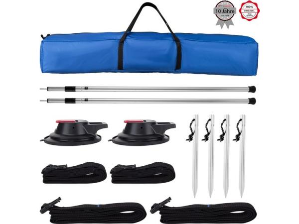 ULTRASPORT Zonnekap Auto-luifel Deze luifel kan eenvoudig op elke auto of campingbus worden gemonteerd, ideaal als bescherming tegen zon en tegen regen – de vorm kan via 2, 3 of 4 scheerlijnen variabel worden vormgegeven Afhankelijk van het type auto kan je kiezen uit verschillende opstelmogelijkheden: gemonteerd op de dakrailing, op het autodak met zuignappen of met behulp van scheerlijnen Afmetingen: opgesteld (l x b): ca. 190/250 x 250 cm. Materiaal: dekzeil van polyester, gecoat met UPV 80+, waterkolom 4000 mm, stangen van aluminium (dikte 22/25 mm), haringen van aluminium (lengte 18 cm) De levering omvat naast de Ultrasport autoluifel 2 in de lengte verstelbare telescoopstangen, 2 zuignappen, 4 haringen in Y-vorm en 4 spanbanden (2 x 210 cm, 2 x 310 cm)