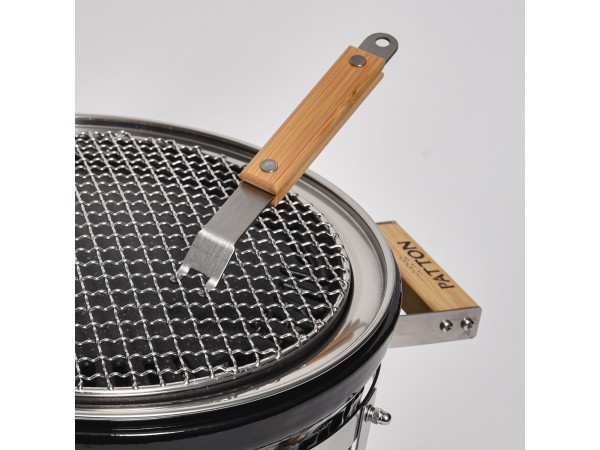 Deze Patton Shichirin vindt zijn oorsprong in de Japanse eet-cultuur en wordt ook wel konro grill genoemd. Een gezellig samenzijn van het gezin of met vrienden werd altijd beleefd door met elkaar te drinken en vooral eten. Een compacte shichirin tafelgrill, waarop kleine stukjes vlees en groentes door alle tafelgasten zelf bereid werden en nog worden. Een avondvullende gezelligheid en lekker genieten. De ronde Patton Shichirin is geschikt voor 4 tot 6 personen en is voorzien van zowel een rond RVS grill rooster voor kleinere stukjes vlees, vis of groente alsook van een licht bolle grillplaat met anti-aanbak laag. Voor onder deze grillplaat is een lek-ring bijgeleverd, te plaatsen in de keramische grill romp, zodat er geen vocht op de hete kolen druipt. Tevens wordt een handgreep voor het rooster en de grillplaat bijgeleverd, zodat men tussendoor nieuwe kooltjes toe kan voegen. De bijgeleverde ronde bamboe onderplaat beschermt het tafelblad tijdens het grillen. De Ronde Patton Shichirin is inclusief het fijnmazig RVS rooster. Er doorheen zie je de bijgeleverde anti-lek ring voor gebruik met de bijgeleverde grillplaat. In Japan wordt in de Shichirin grill het Japanse Binchotan houtskool gebruikt. Een op unieke wijze geproduceerd houtskool, waardoor er meer dan 95% koolstof overblijft, afhankelijk van de kwaliteit. Daarmee kan het houtskool bed temperaturen bereiken van 870 tot boven de 1000 °C. Bovendien heb je een erg lange brandduur van minimaal 4 uur en soms tot 6 uur voor de beste kwaliteit. Uiteraard zijn al prima grill resultaten te behalen met de betere quebracho of marabu houtskool soorten.