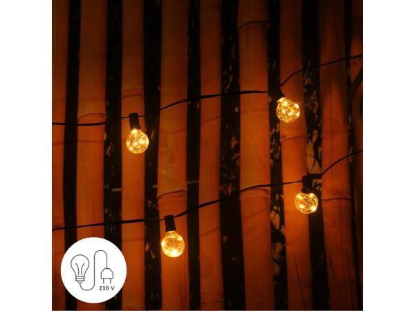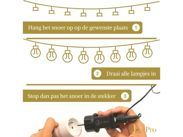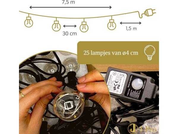 BELANGRIJK BIJ BESTELLEN: Lampen zijn ø4cm groot, met 25cm tussen elke lamp op 6,5m snoer. Ondersteun de lampjes om de 2m om doorhangen en breuk te voorkomen.