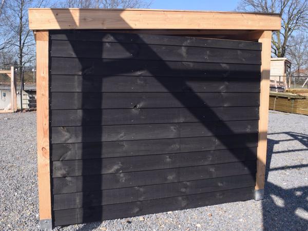 Afmeting berging: 250x400 cm. Bestaande uit: Palen: Douglas fijn bezaagd 12x12 cm Draagliggers: Douglas fijn bezaagd 12x12 cm Dakbalken: Douglas fijn bezaagd 5x15 cm en dakplanken: 18 mm dik. Dakleer: brandrol. Voorzien van bouwbeschrijving en bevestigingsmateriaal. Deur: met hang- en sluitwerk, 100 cm breed. Het kavel wordt als een bouwpakket geleverd, zonder paalhouders. Afmeting van het pakket: 425x125x100 cm, 950 kg