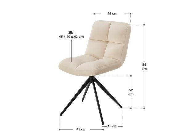 De draaistoel Dallas met rugleuning en gewatteerde bekleding nodigt uit om comfortabel te blijven hangen. Neem plaats op de zachte hoes en tover jouw eetkamer om tot een oase van welzijn. Maar niet alleen het design van de stoel overtuigt, ook de stabiliteit van het gepoedercoate stalen frame en het maximale draagvermogen van 120 kg maken de gestoffeerde stoel tot een duurzame metgezel. Technische data: Framemateriaal: gepoedercoat staal (100%) Materiaal bekleding: polyesterfluweel (100%), gewatteerd Kleur eetkamerstoelen: fluweelbeige/zand Maximaal draagvermogen: 120 kg Toepassingsgebieden: woonkamer, eetkamer Aantal: Twee stoelen Functie: Draaibaar