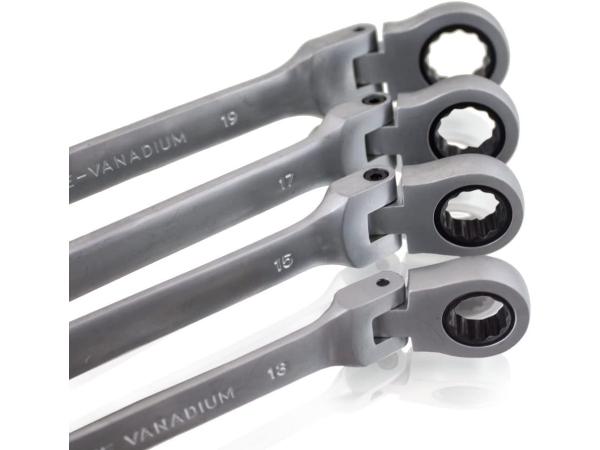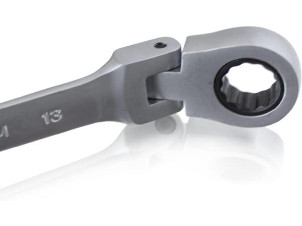 12-delige scharnierringsleutel, ratelsleutel, ringsleutel, steeksleutel, ratel, gewrichtssleutel, steeksleutelgereedschapset, 72 tanden / 5 graden terughaalhoek / maten 6 mm t/m 19 mm De set bestaat uit 12 ratelsleutels met gewrichtskoppen, waarmee u op moeilijk bereikbare plaatsen kunt werken. Het gereedschap is gemaakt van robuust en duurzaam chroom-vanadiumstaal en wordt geleverd in een stevige kunststof koffer voor veilig opbergen en transporteren. Ratelsleutel: 6 mm, 7 mm, 8 mm, 9 mm, 10 mm, 11 mm, 12 mm, 13 mm, 14 mm, 15 mm, 17 mm, 19 mm (5 graden terughaalhoek / 72 tanden) TECHNISCHE GEGEVENS: Maten: 6 mm, 7 mm, 8 mm, 9 mm, 10 mm, 11 mm, 12 mm, 13 mm, 14 mm, 15 mm, 17 mm, 19 mm Aantal tanden: 72 Retourhoek: 5 graden Materiaal behuizing: kunststof Materiaal gereedschap: chroom-vanadiumstaal Leveringsomvang: - Elk 1x scharnierratelsleutel: 6 mm, 7 mm, 8 mm, 9 mm, 10 mm, 11 mm, 12 mm, 13 mm, 14 mm, 15 mm, 17 mm, 19 mm